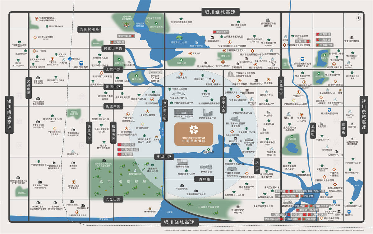 银川中海甲叁號院东侧紧邻宁安大街,与城市发展的脉搏同频共振;东南角零距离直抵华雁湖公园,推门即是湖光水色。更难得的是,典农河从项目东侧蜿蜒至南侧,再绕至西侧,三面环抱,将地块温柔包裹,形成中国传统堪舆中至为吉利的“玉带环腰”格局。