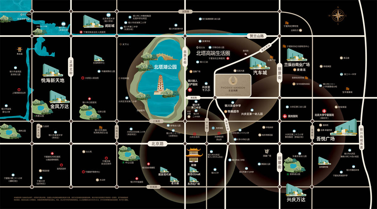 北塔凤鸣位于银川市兴庆区,北塔湖区域,项目1公里辐射北塔湖、海宝公园、兰溪谷商务广场,三公里辐射吾悦广场商圈、新华街商圈,五公里辐射金凤万达、兴庆万达、阅彩城等,国龙医院、宝丰医院、银川市自治区人民医院等环伺,项目隶属北塔高端板块,共建19栋楼,主要以小高层和瞰景高层为主,自建3000㎡业主会所,涵盖泳游馆、健身房、瑜伽室、壁球馆、共享花园等, 配置超50米酒店式入户大堂,采用宝格丽同款奢侈材质,让归家更有仪式感。