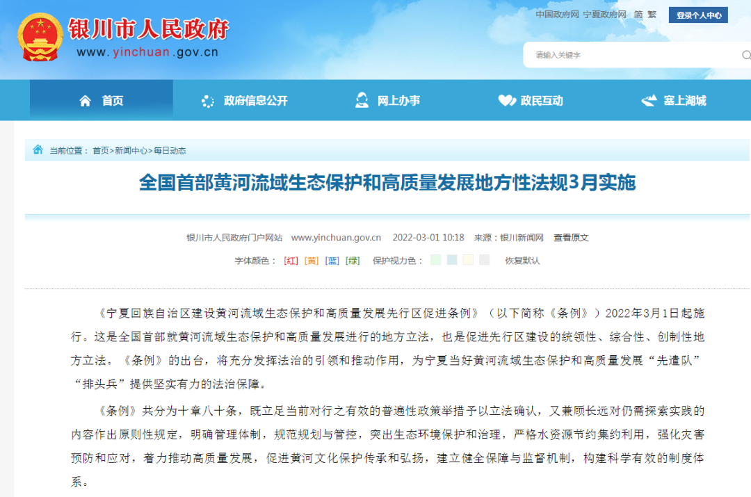 3月1日,银川市人民政府发布《全国首部黄河流域生态保护和高质量发展地方性法规3月实施》的通知。