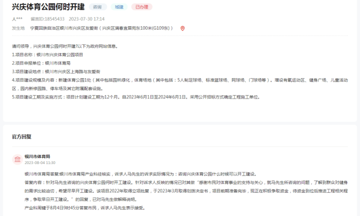 银川市体育局回复:银川市体育局产业科经核实,诉求人马先生的诉求实际情况为:咨询兴庆体育公园什么时候可以开工建设。答复内容:针对马先生咨询的兴庆体育公园何时开工建设。针对诉求人反映的情况已对其做“感谢市民对体育事业的支持与关心,就马先生所咨询的问题,了解到群众对健身的需求比较迫切,希望尽早开工建设。该项目2022年取得立项批复,于2023年3月取得划拨决定书,项目前期准备完毕,现正在积极争取资金,待资金到位后推进工程相关程序,争取早日开工建设。”的回复,已对马先生做解释说明。