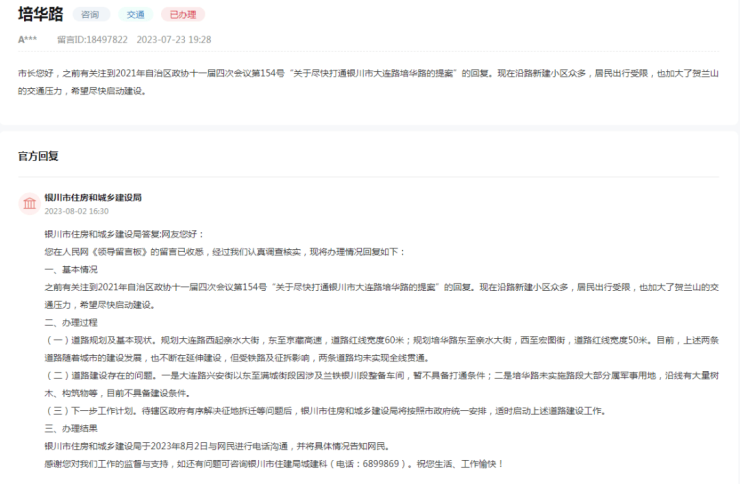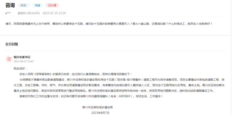 银川市住房和城市建设局:网友您好: 您在人民网《领导留言板》的留言已收悉,经过我们认真调查核实,现将办理情况回复如下: