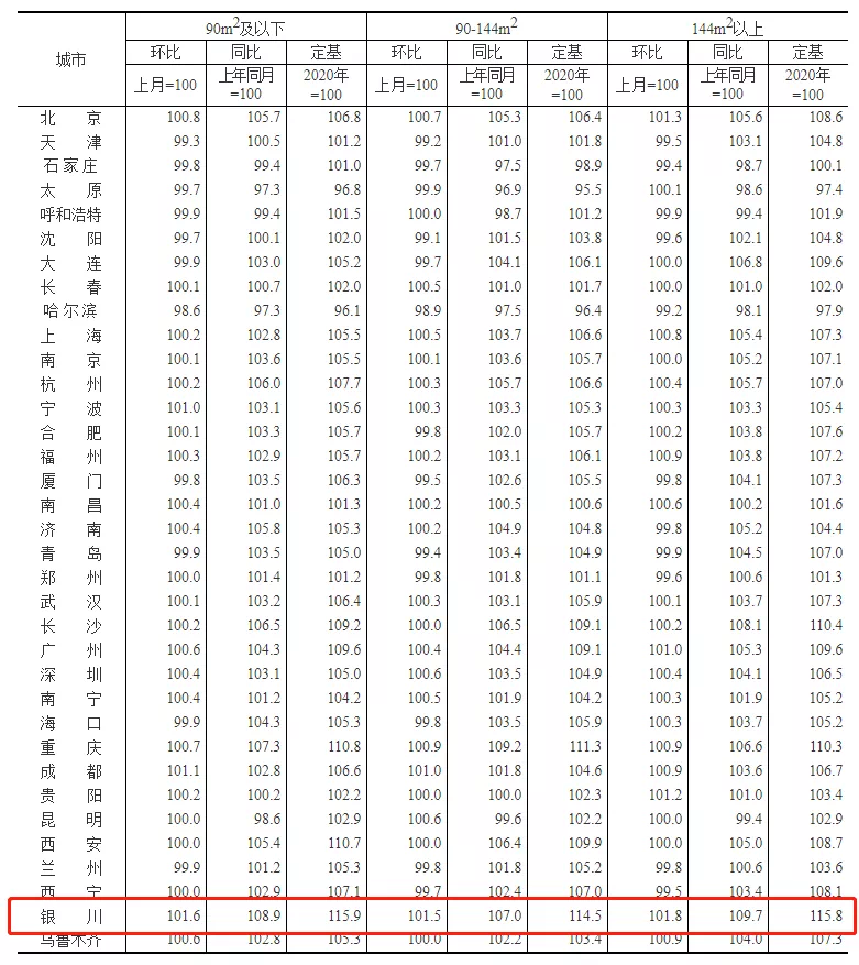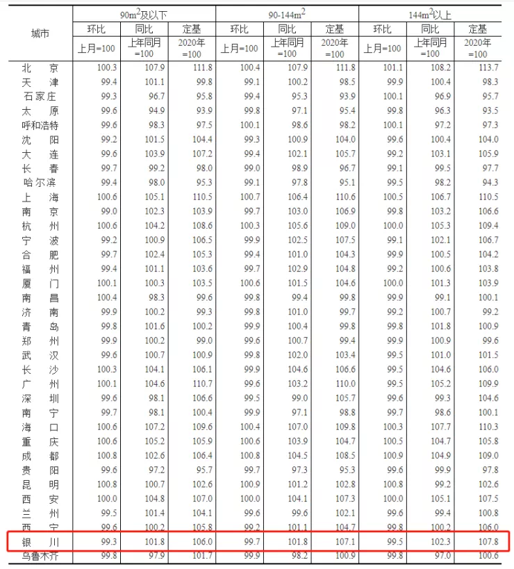 银川90㎡及以下商品房销售价格环比上涨1.6%,同比上涨8.9%;90-144㎡商品房销售价格环比上涨1.5%,同比上涨7.0%;144㎡以上商品房销售价格环比上涨1.8%,同比上涨9.7%。