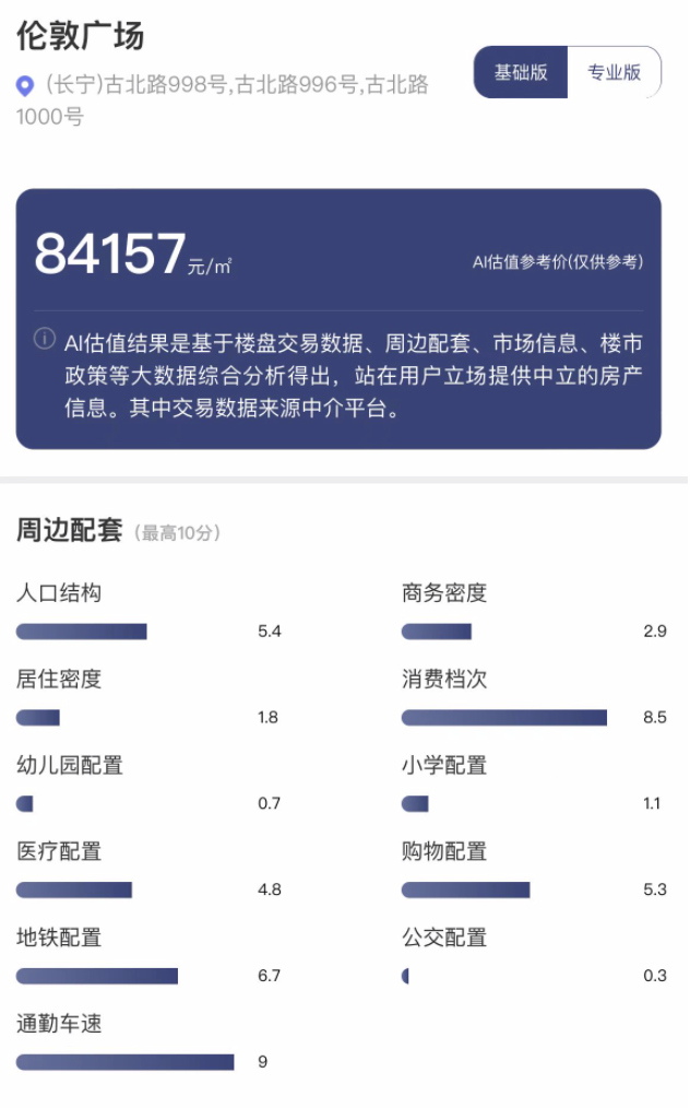 根据每经品房小程序通过周边配套、市场信息、交易数据等综合测算,伦敦广场估值参考价为84157元/平方米,接近当前二手房挂牌均价,并且在购物、出行、医疗等方面占据较大的优势。