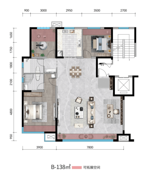 最为重要的一点,建面约138㎡户型可将可变空间部分改成一个南向次卧,随需要随心定制。