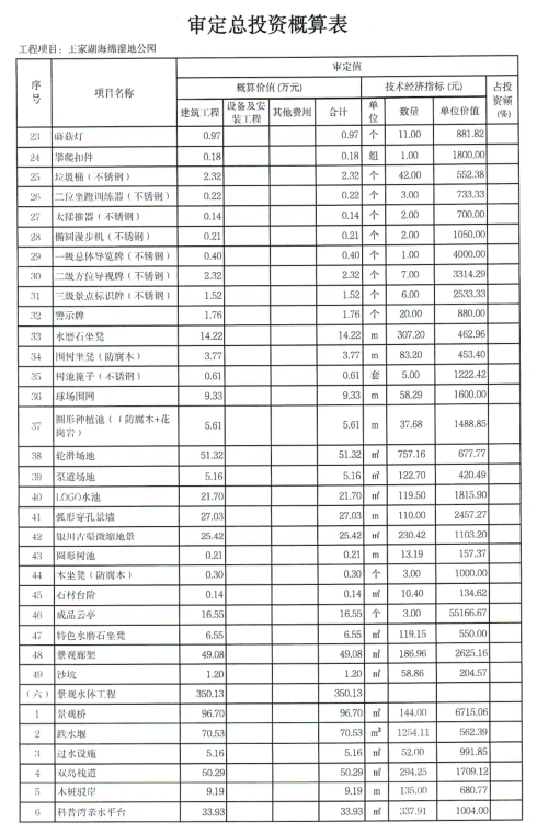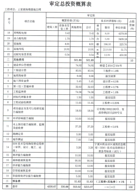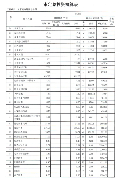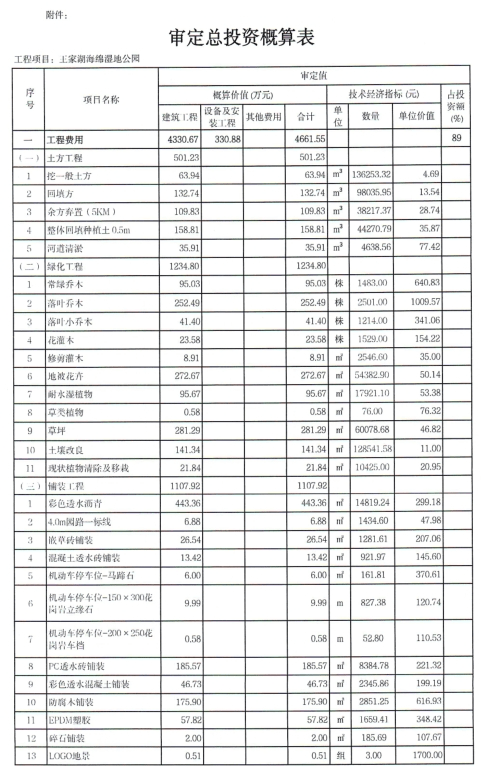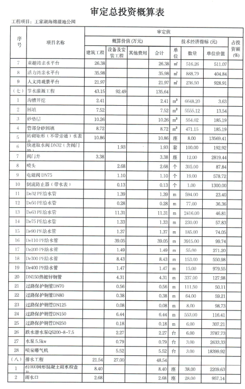经审定,本项目概算总投资5215.07万元,其中:工程费用4661.55 万元、其他费用501.89万元、预备费51.63万元。资金来源为海绵城市专项资金及市财政配套。