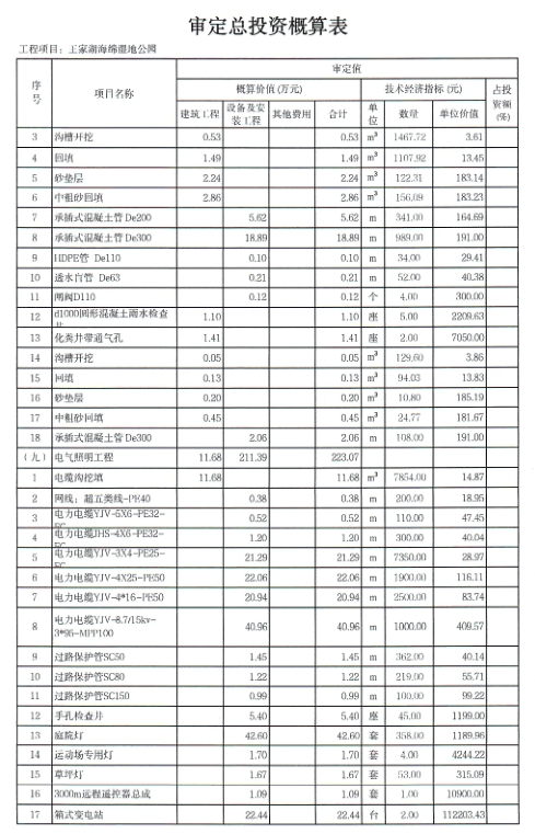 安装 3.5米高庭院灯358盏、草坪灯53盏、6米高运动场专用灯4盏;设置景观照明配电柜8座、景观动力配电柜5座、160KVA箱式变电站2台、远程遥控器总成1套;安装电缆(YJV-5X6-PE32-FC)110米、安装电缆(JHS-4X6-PE32-FC)300米、安装电缆(YJV-3X4-PE25-FC)7350米、安装电缆(YJV-4X25-PE50)1900米、安装电缆(YJV-4*16-PE50)2500米、安装电力电缆(YJV-8.7/15kv-3*95-MPP100)1000米、安装网线(超五类线-PE40)200米、安装过路钢管681米;设置成品手孔检查井45座。