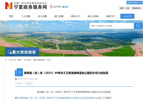 近日,银川审批管理局发布关于《王家湖海绵湿地公园初步设计的批复》具体详情如下。