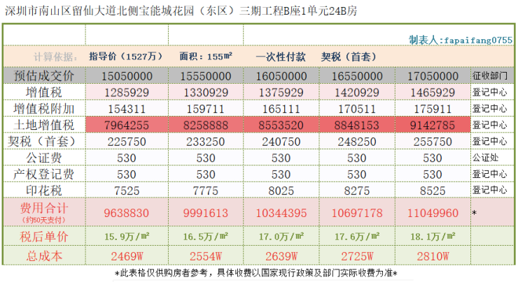 市场上关于税费讨论分为两种,一是已出证,是公司产权,原登记价格低,这样会产生60%土地增值税,看起来税费非常高;另一种可能,因为开发商名下物业,按照新房现售原则,只有契税,按照成交价首套1.5%,二套3%缴纳。