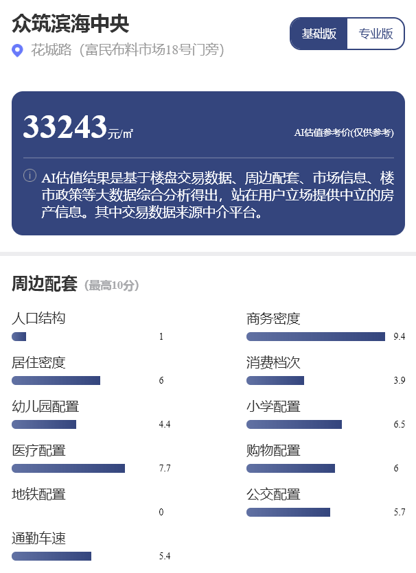 通过对招商保利依城大观项目周边11个维度进行综合测评后,每经品房小程序显示,该项目的估值参考价为17506元/平方米,与当前销售价格较为一致。