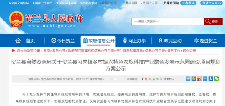 12月7日,贺兰县自然资源局发布了“贺兰县习岗镇乡村振兴特色农旅科技产业融合发展示范园建设项目规划方案公示”的信息。