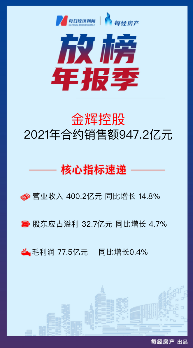 2021年全年,金辉控股实现合约销售额947.2亿元,合约销售面积579万平方米,平均售价1.64万元/平方米。