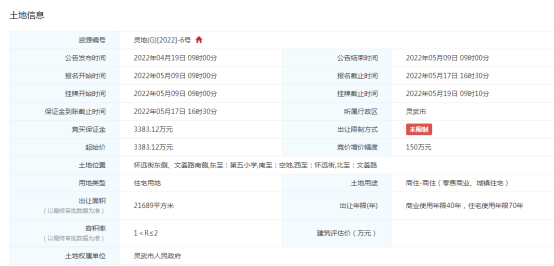 刚刚,经过20轮激烈竞价灵地(G)[2022]-6号地块被灵武市欣荣房地产开发有限责任公司,以总价6233.12万元拿下,楼面价为1437元/㎡,溢价率为84%;