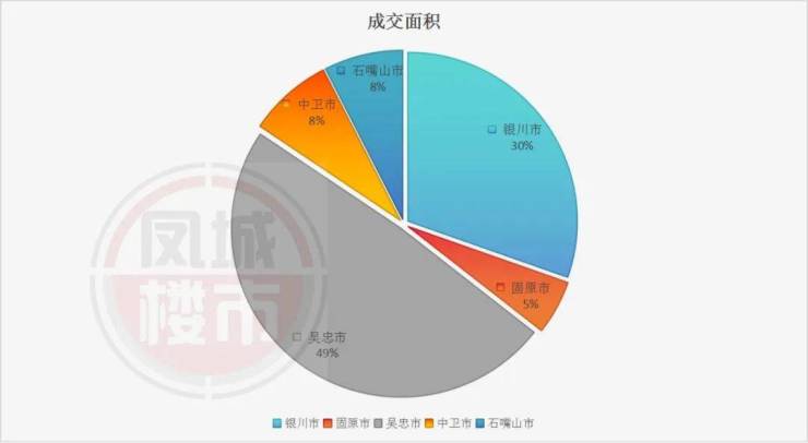 从成交面积来看,吴忠市占比49%,成交面积最多,银川市第二,占比30%,固原市则成交面积最少,占比5%;
