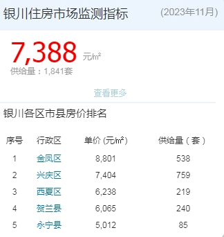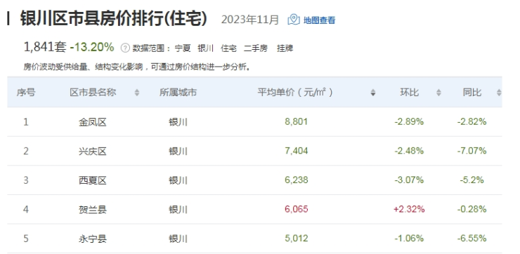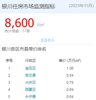 三区两县排名为:金凤区(8801元/㎡)>(兴庆区7404元/㎡)>西夏区(6328元/㎡)>贺兰县(6065元/㎡)>永宁县(5012元/㎡)