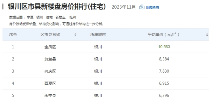 三区两县排名为:金凤区(10563元/㎡)>(贺兰县8384元/㎡)>兴庆区(7830元/㎡)>西夏区(6915元/㎡)>永宁县(6396元/㎡)