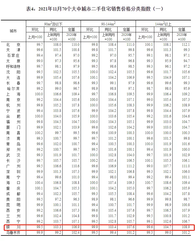 10月70个大中城市二手住宅销售价格分类指数数据显示,银川90㎡及以下二手房销售价格环比下降0.5%,同比上涨3.3%;90-144㎡二手房销售价格环比下降0.1%,同比上涨3.4%;144㎡以上二手房销售价格环比下降0.4%,同比上涨4.7%。