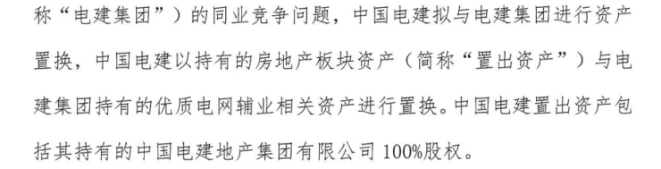 2021年9月28日,电建地产的母公司中国电建发布公告称,拟将所持房地产板块资产与电建集团持有的优质电网辅业相关资产进行置换,理由是为了解决同业竞争问题。而电建地产则是中国电建旗下主要的房地产资产。