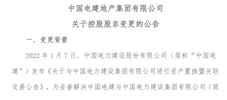 今年3月31日,电建地产公告称,“截至本公告日,公司已完成控股股东工商登记变更程序,公司控股股东由中国电建变更为电建集团,实际控制人仍为国务院国资委,实际控制人未发生变更。”