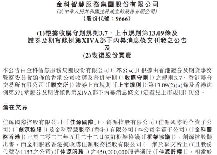 停牌一天后,今日(5月24日)午间,金科服务(09666.HK)发布公告称,拟收购佳源服务(01153.HK)4.5亿股普通股,相当于佳源服务所有已发行股份约73.56%(潜在交易),并于今日下午1时复牌。