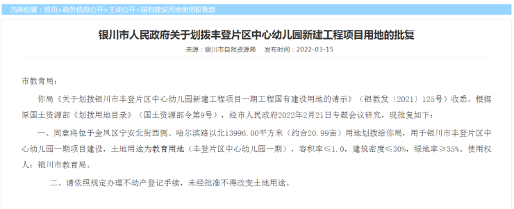 近日,银川市自然资源局发布《关于划拨丰登片区中心幼儿园新建工程项目用地批复》,该文件的发布意味着,丰登中心幼儿园一期可以动工了。