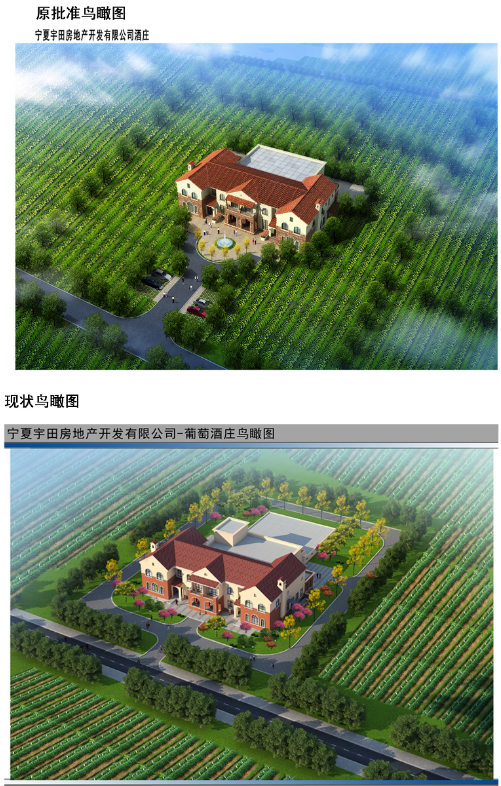 该项目于2018年12月批准规划设计方案,现由于酒庄周围没有遮挡物,长时间风吹日晒,有石材脱落的隐患,故将酒庄建筑外立面进行变更,外墙面砖红色石材改为赫石色真石漆,象牙白石材改为浅米色真石漆,坡屋面瓦由砖红色改为暗红色。