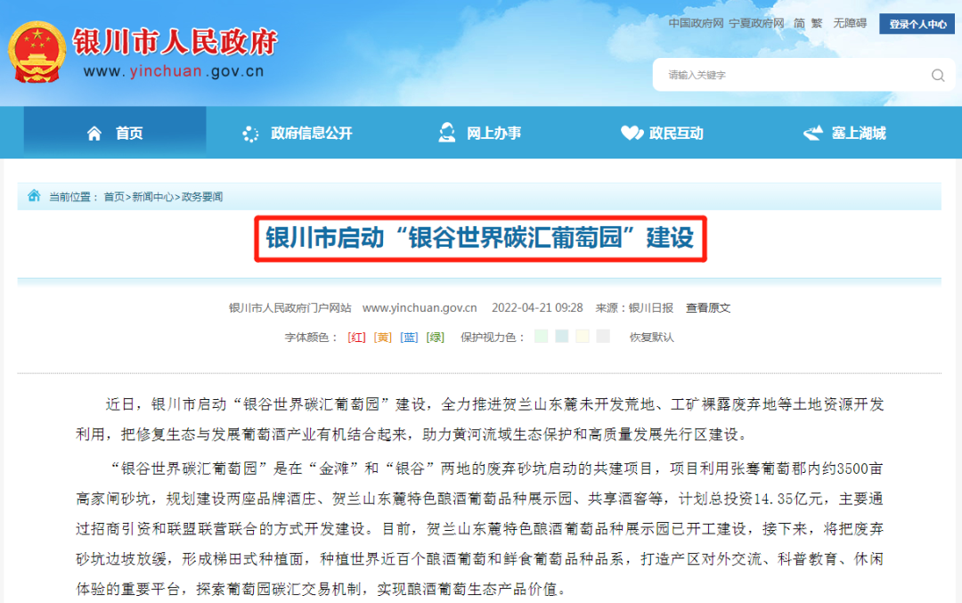 今天银川市人民政府网站发布了关于《银川市启动“银谷世界碳汇葡萄园”建设》的信息,其中明确接下来银川,将会全力推进贺兰山东麓未开发荒地、工矿裸露废弃地等土地资源开发利用,把修复生态与发展葡萄酒产业有机结合起来,助力黄河流域生态保护和高质量发展先行区建设。