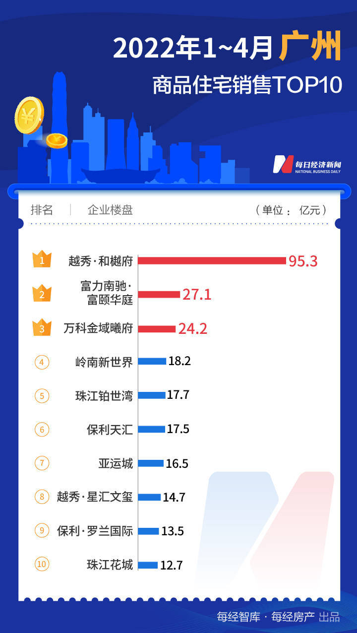 广州TOP10项目中,越秀·和樾府、富力南驰·富颐华庭、万科金域曦府销售额分别是95.3亿元、27.1亿元和24.2亿元,占据了TOP10总销售额的60%。