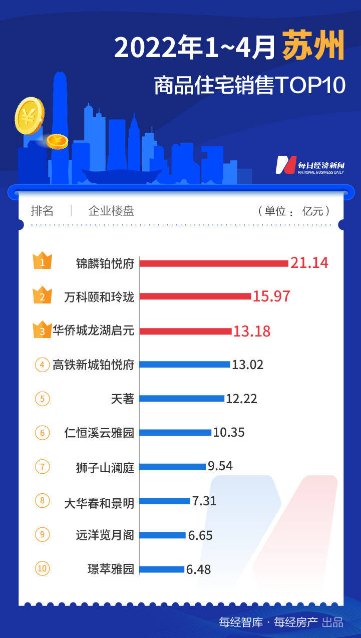 苏州1-4月TOP10项目合计销售额115.8亿元,特别是4月份,单月销量较前3个月的平均水平更低,在新一线城市中表现稍弱。