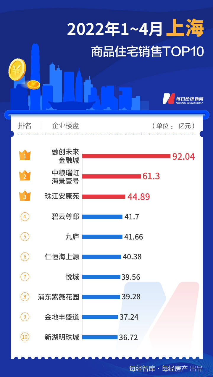 尽管疫情突袭,但上海TOP10项目1-4月成交金额仍然位列全国第二,仅次于深圳。4月份上海销售金额排位变动不大,TOP10仍然以10万+高端住宅为主,融创未来金融城、中粮瑞虹海景壹号、珠江安康苑分别以92.04亿元、61.3亿元、44.89亿元位列前三甲。