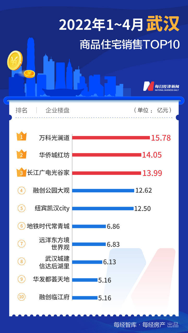 同样作为重点二线城市,武汉1-4月整体销售情况不及同级别的成都、西安等城市,TOP10项目合计销售额不足百亿元。