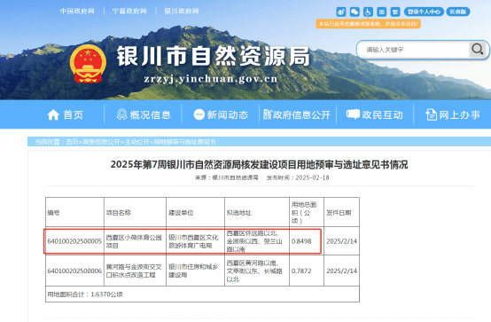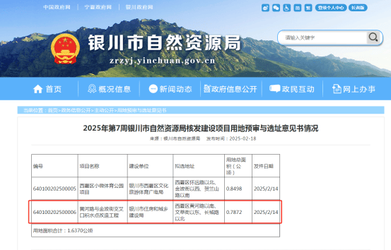 近日,银川市自然资源局发布2宗项目建设用地预审与选址意见书,具体详情如下: