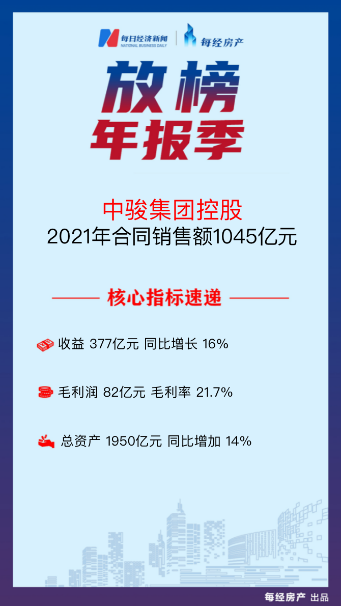 报告显示,中骏集团2021年实现合约合同销售1045亿元,收益377亿元,较2020年增长16%。