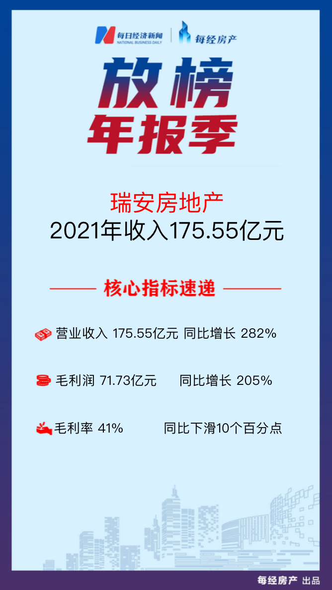 每日经济新闻2022-03-24 21:11:30 每经记者 包晶晶 每经编辑 陈梦妤 3月24日,瑞安房地产(00272.HK)发布了2021年业绩报告。 报告显示,瑞安房地产2021年收入为人民币175.55亿元,较上年增长282%;毛利约71.73亿元,同比增长205%;毛利率为