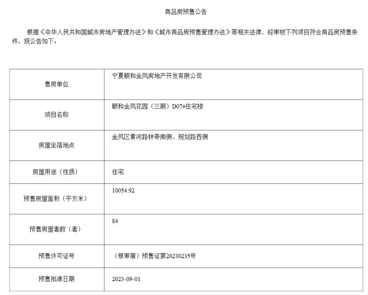 4、颐和金凤花园(三期)D07#住宅楼商品房预售公告