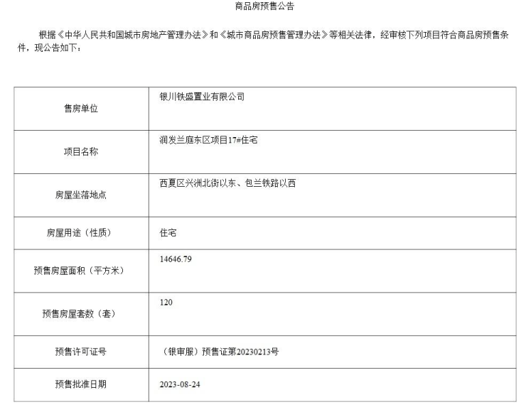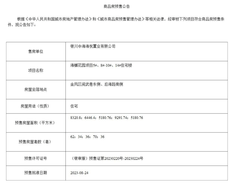 9月7日,银川市政府网站又公示了8家取得预售许可证的项目,分别是润发兰庭、金东豪庭、央御、颐和金凤花园、万锦公馆、 润发兰庭、 泰云庭、海樾花园。