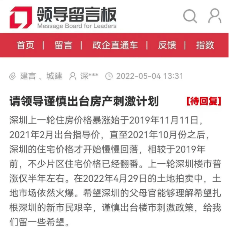 一则是希望深圳谨慎出台房产刺激计划,该网友表示,深圳房价距离上一轮深圳楼市普涨仅半年,而且今年首次集中供地依然火爆,希望官方谨慎出台楼市刺激政策,给扎根深圳的新市民留一些希望。