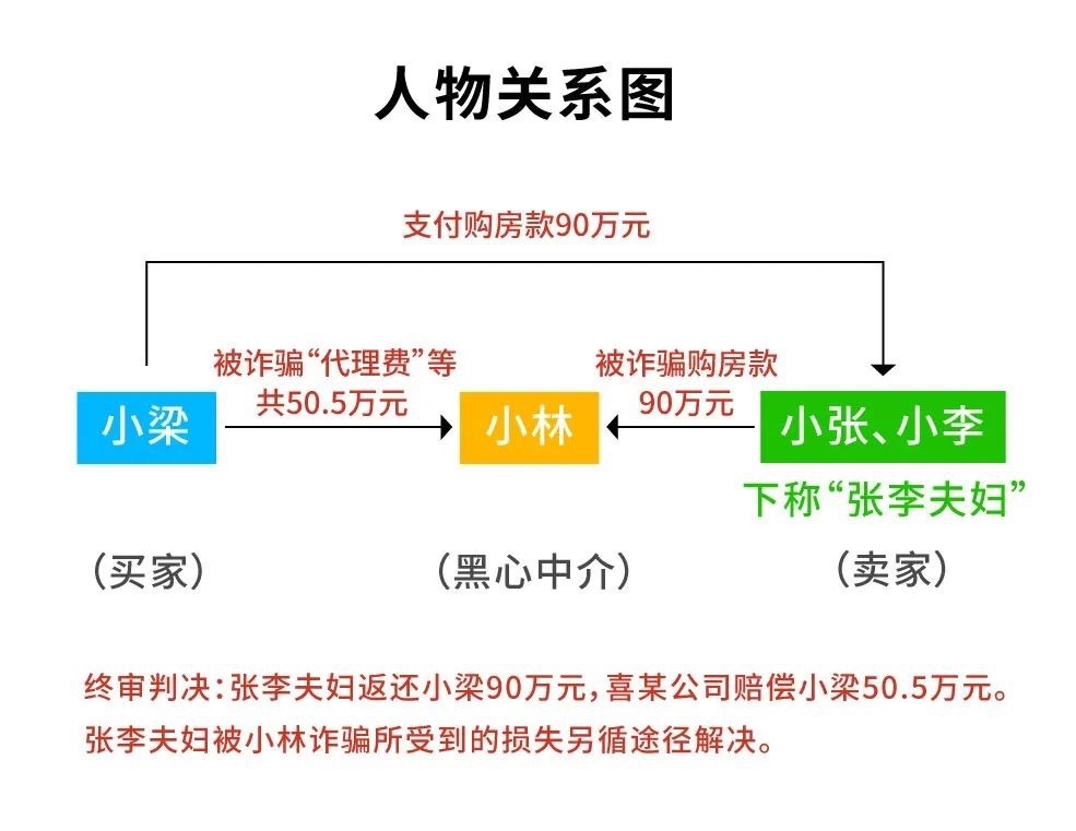 据披露,2020年3月至6月,买家小梁通过喜某公司员工小林的介绍购买了卖家小张、小李夫妇(下称张李夫妇)名下的一套房子。小梁向张李夫妇支付购房款共90万元,并与张李夫妇、喜某公司签订了一份《房地产买卖及居间合同》。