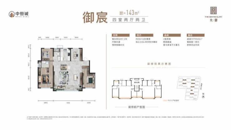 它的所有户型都是户型方正、南北通透、动静分离的设计,在细节做到入户玄关、南向宽景阳台设计,减少空间浪费。【央御】将产品定位为建面约119-143㎡的三居四居,充分满足人居不同需求。