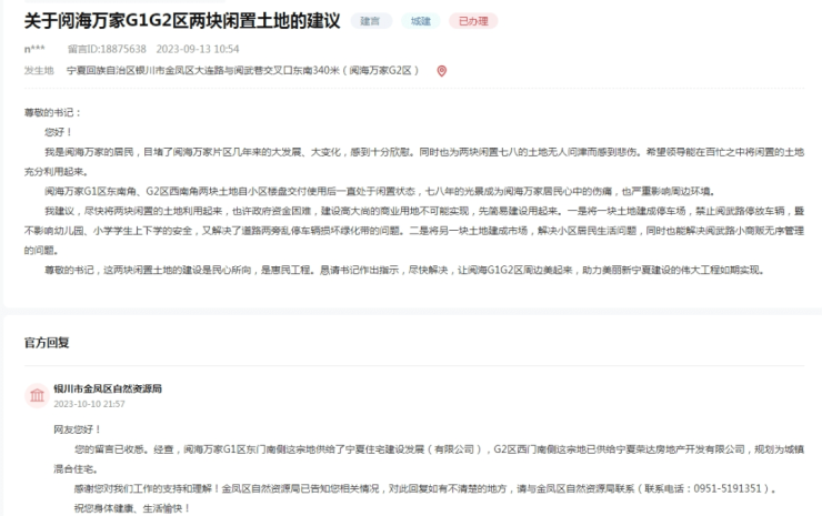 网友咨询:尊敬的书记:您好!我是阅海万家的居民,目堵了阅海万家片区几年来的大发展、大变化,感到十分欣慰。同时也为两块闲置七八的土地无人问津而感到悲伤。希望领导能在百忙之中将闲置的土地充分利用起来。阅海万家G1区东南角、G2区西南角两块土地自小区楼盘交付使用后一直处于闲置状态,七八年的光景成为阅海万家居民心中的伤痛,也严重影响周边环境。我建议,尽快将两块闲置的土地利用起来,也许政府资金困难,建设高大尚的商业用地不可能实现,先简易建设用起来。一是将一块土地建成停车场,禁止阅武路停放车辆,暨不影响幼儿园、小学学生上下学的安全,又解决了道路两旁乱停车辆损坏绿化带的问题。二是将另一块土地建成市场,解决小区居民生活问题,同时也能解决阅武路小商贩无序管理的问题。尊敬的书记,这两块闲置土地的建设是民心所向,是惠民工程。恳请书记作出指示,尽快解决,让阅海G1G2区周边美起来,助力美丽新宁夏建设的伟大工程如期实现。