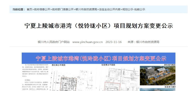 2023年11月16日,银川市自然资源局公示了宁夏上陵城市港湾(悦铃珑小区)项目规划方案变更公示,公示时间为2023年11月16日至2023年11月24日。