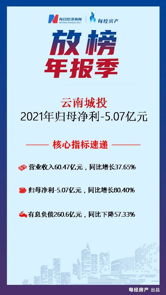 每日经济新闻2022-04-25 22:40:10 每经记者 陈利 每经编辑 魏文艺 今日(4月25日)晚间,云南城投置业股份有限公司(*ST云城,600239.SH)发布2021年度业绩报告。 报告期内,*ST云城实现营业收入60.47亿元,同比增长37.65%;归属股东净亏损5.0