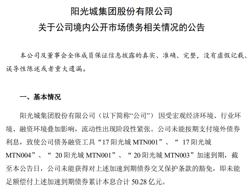 阳光城表示,未能按期支付境外债券利息,致使公司债务融资工具“17阳光城MTN001”“17阳光城MTN004”“20阳光城MTN001”“20阳光城MTN003”加速到期。截至本公告日,阳光城未能获得对上述加速到期债券交叉保护条款的豁免,即未能足额偿付上述加速到期债券累计本息合计50.28亿元。