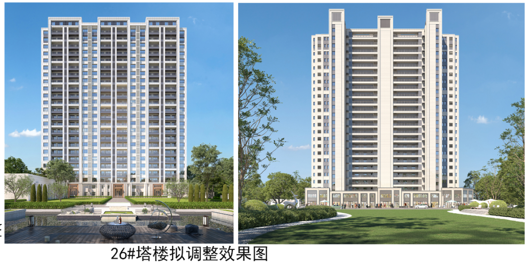 1、将原批准26#住宅楼立面阳台及窗间墙局部由米白色调整为灰色,调整后立面与其他住宅楼栋外立面风格保持一致。