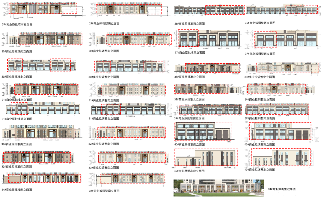 2、将原批准29#~40#商业楼外立面女儿墙高低节奏错落、外立面门头、立面装饰分缝线条等进行局部细节调整。