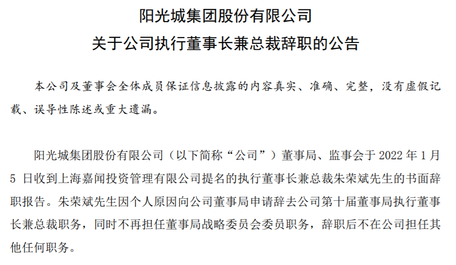 今日(1月5日)晚间,阳光城集团股份有限公司(000671.SZ;以下简称阳光城)发布公告称,公司董事局、监事会于2022年1月5日收到上海嘉闻投资管理有限公司提名的执行董事长兼总裁朱荣斌先生的书面辞职报告。朱荣斌先生因个人原因向公司董事局申请辞去公司第十届董事局执行董事长兼总裁职务,同时不再担任董事局战略委员会委员职务,辞职后不在公司担任其他任何职务。