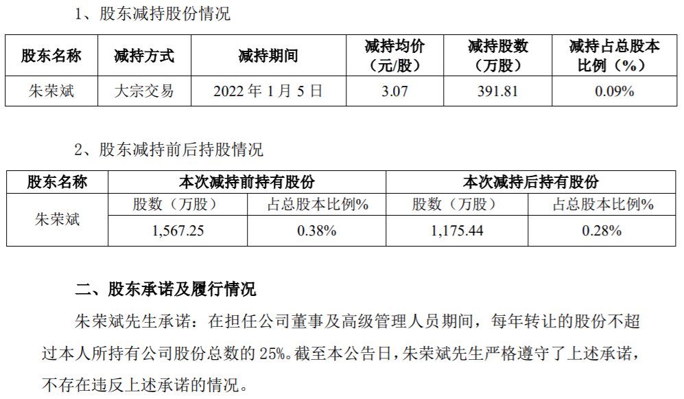 同日,阳光城公告称,于近日收到公司执行董事长兼总裁朱荣斌先生《关于通过大宗交易减持公司股份的告知函》。因个人资金需求,公司董事兼执行董事长朱荣斌先生于2022年1月5日通过深圳证券交易所大宗交易系统减持其持有的公司无限售条件流通股391.81万股,占公司总股本0.09%。