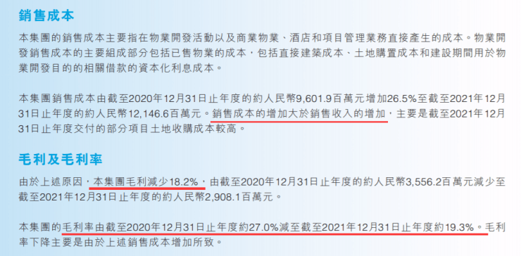 年报显示,截至2021年末,领地控股剔除预收账款的资产负债率为72.14%,净负债率为62.27%,现金短债比为1.25,“三道红线”指标处黄档。由于高价地进入结转期,叠加规模扩张带来的销管费用上涨等原因,2021年领地控股还陷入“增收不增利”的境地,实现营业收入150.55亿元,同比增长14.41%;归属母公司净利润4.88亿元,同比下降43.22%;毛利率由2020年的27%降至约19.3%。