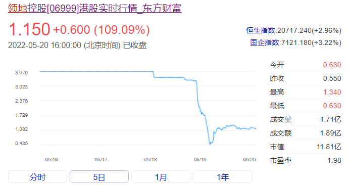 或许是这则公告起了作用,今日早间,领地控股股价大幅上涨,于11点17分触及股价高点,盘中较高涨幅达141.82%。此后有所回落,截至今日收盘,领地控股股价报1.15港元/股,涨幅109.09%,总市值11.8亿港元。但即便如此,领地控股市值仍较5月18日收盘时蒸发约23.4亿港元。