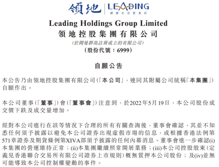 当日晚间,领地控股公告称,公司运营一切正常,控股股东无质押公司股份的情况,无可能有导致公司控制权变动的事件,公司董事会也并不知悉任何须予披露以避免公司证券出现虚假市场的信息。