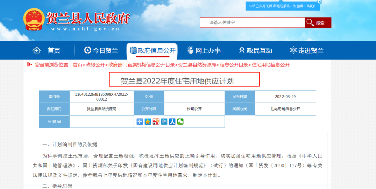 近日,贺兰县人民政府公布了贺兰县2022年度住宅用地供应计划: